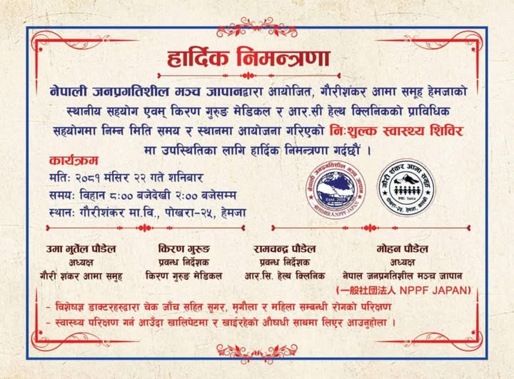 मंसिर २०, हेमजा । नेपाली जनप्रगतिशिल मञ्च जापानको आयोजनामा यहि मंसिर २२ गते हेमजामा निशुल्क स्वास्थ्य शिविर हुने भएको छ ।