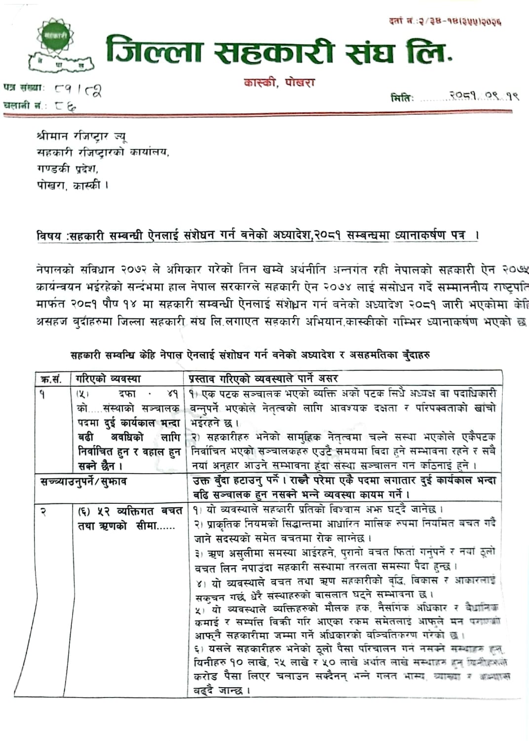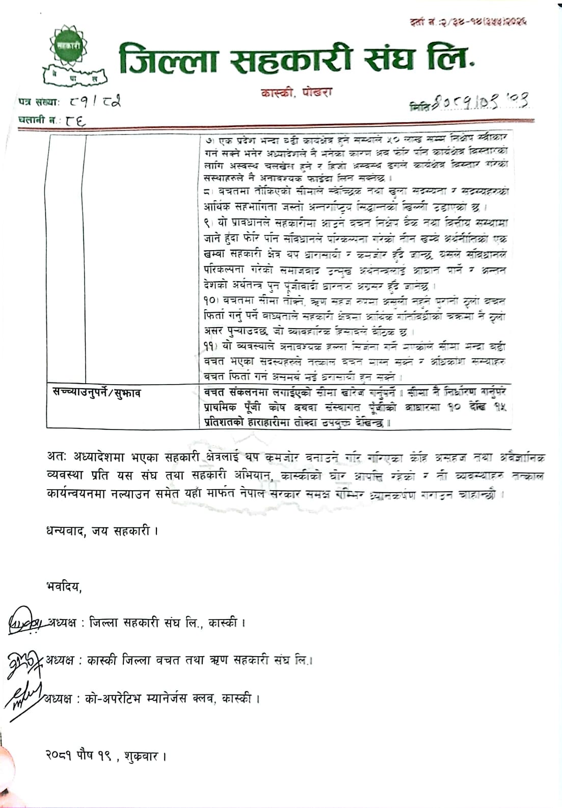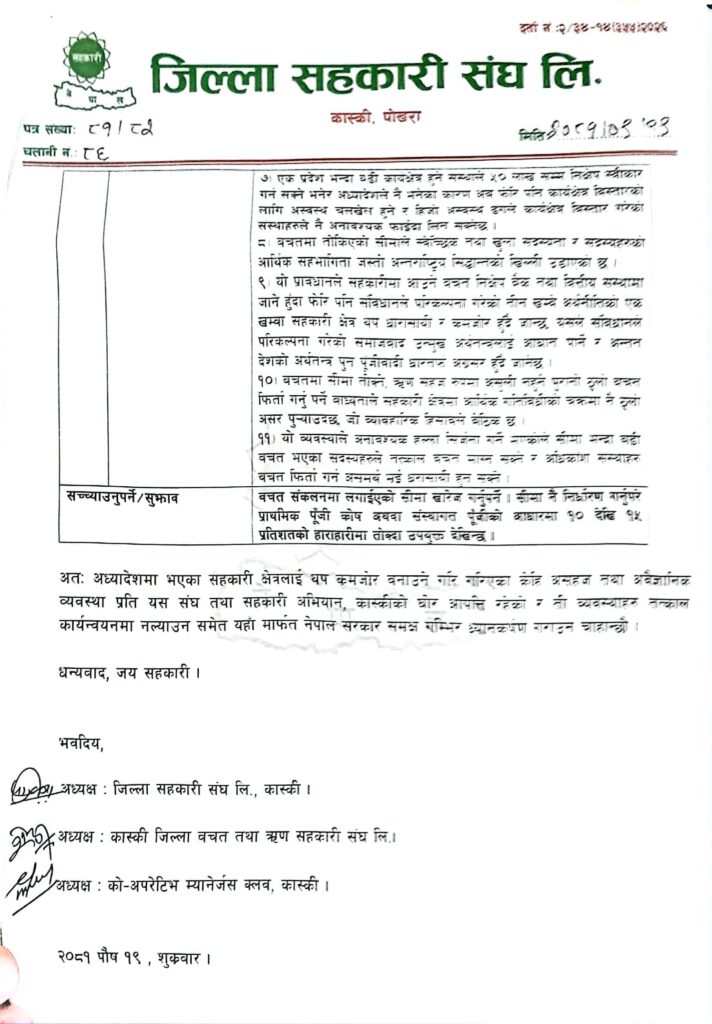 कार्यक्रमका बिच जिल्ला सहकारी संघ लि.कास्की, कास्की जिल्ला बचत तथा ऋण सहकारी संघ लि. र को–अपरेटिभ म्यानेर्जस क्लब, कास्कीले संयुक्त रूपमा रजिस्टार भेषराज रिजाललाई सहकारी सम्बन्धमा, ऐनलाई संशोधन गर्न बनेको अध्यादेश,२०८१ सम्बन्धमा ध्यानाकर्षण पत्र बुझाएका थिए । ध्यानाकर्षण पत्र जस्ताको त्यस्तै ।