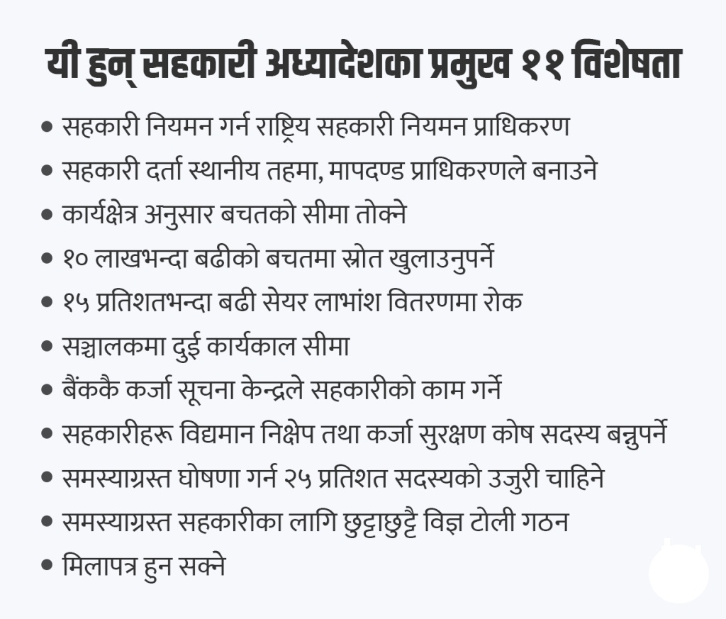 सभालाई सम्बोधन गर्दै सहकारी रजिष्ट्रारको कार्यालय गण्डकी प्रदेशका रजिस्ट्रार भेषराज रिजालले २०५६ देखि सहकारी संघको निरन्तर सक्रियताले आर्थिक तथा सामाजिक क्षेत्रमा महत्वपूर्ण योगदान पुर्याएको बताउनु भयो । सोही अवसरमा सहकारी अध्यादेशको निम्न नयाँ व्यवस्था बारे थप प्रस्ट पार्नुभएको थियो ।