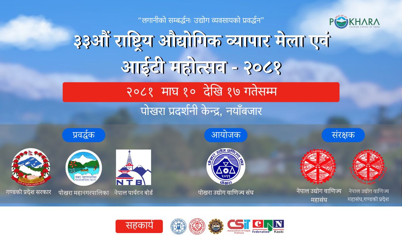 पोखरा । पोखरा उद्योग वाणिज्य संघका अध्यक्ष गोकर्ण कार्कीले यही माघ १० गते सुरु हुने ३३औं संस्करणको राष्ट्रिय औद्योगिक व्यापार मेला तथा प्रथम आइटी महोत्सव प्रवद्धर्नात्मक हुने बताएका छन् । मेलाको तयारीको क्रममा मङ्गलवार आयोजना गरिएको बस्तुगत संघ÷संस्थाका प्रतिनिधिहरुसँगको बैठकमा उनले मेला उद्यमशीलता विकासको उद्देश्यले आयोजना गरिएको र त्यसमा व्यापारभन्दा पनि प्रवर्द्धन र नयाँ सम्भावनाका खोजी मात्र गरिने जिकिर गरेका हुन् ।