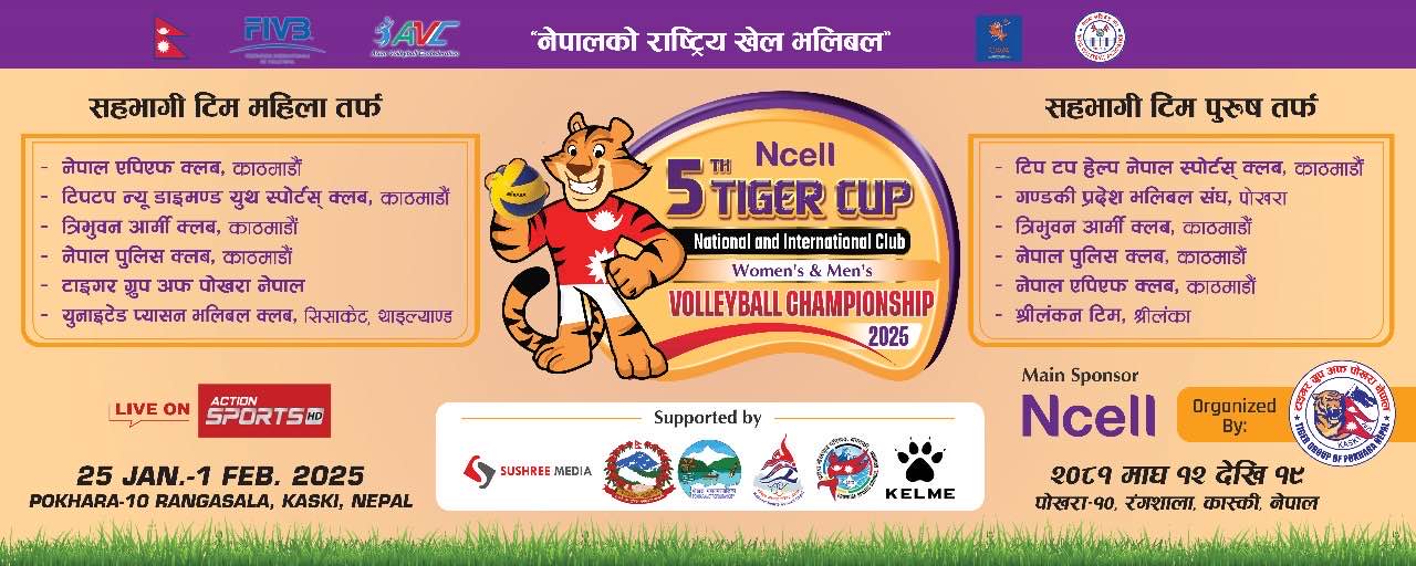 एनसेल पाँचौँ टाइगर कप भलिबल माघ १२ देखि १९ गतेसम्म पोखरा रंगशालामा ।