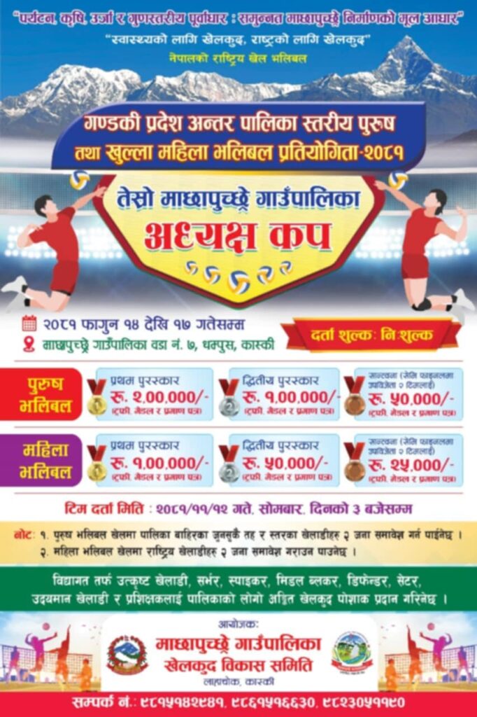स्थानिय स्तरबाट खेलाडि उत्पादन गर्ने उद्देश्यका साथ आयोजना गर्न लागेको तेस्रो माछापुच्छ्रे गाँउपालिका अध्यक्ष कप गण्डकी प्रदेश पालिका स्तरीय पुरुष तथा महिला भलिबल प्रतियोगिताको गण्डकी प्रदेश भित्रका सम्पूर्ण पालिकालाई पत्रचार गरि वढि भन्दा वढि सहभागिता जनाउने लक्ष्य रहेको माछापुच्छ्रे गाँउ पालिका अध्यक्ष मिनबहादुर गुरुङले जानकारी दिए ।