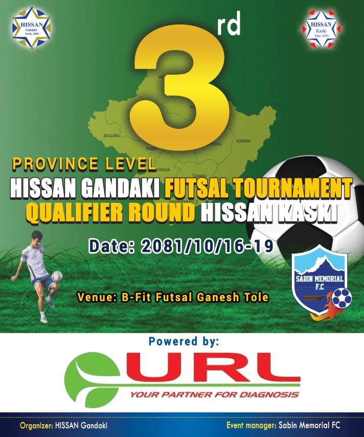 उच्च शिक्षालय तथा माध्यमिक शिक्षालय संघ -हिसान, गण्डकीको आयोजनामा हुने तेस्रो प्रदेशस्तरीय हिसान प्लस टु फुटसल प्रतियोगिताको कास्की छनौट खेलको खेलतालिका सार्वजनीक भएको छ ।